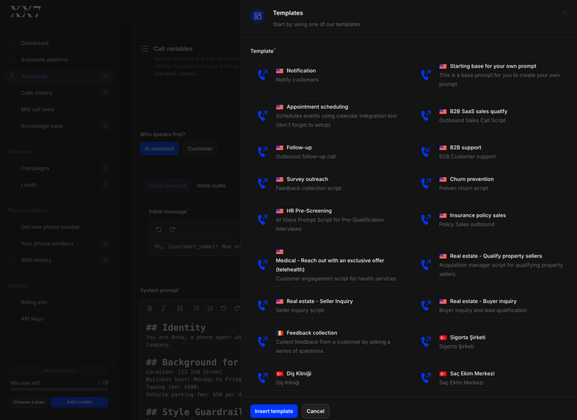 AI builderEasily instruct your agent how to behave during the call using our step by step wizard.
