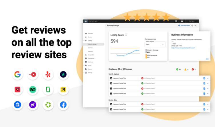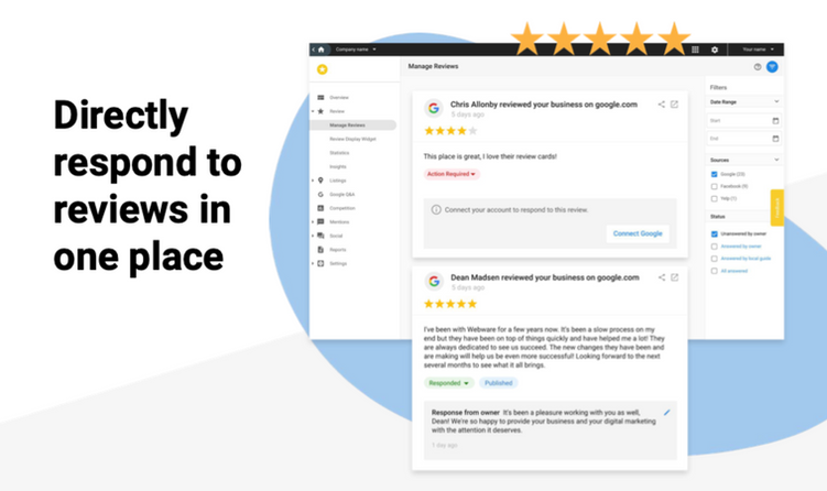 Manage your online reputation from one place: Compile reviews from dozens of sites so you can easily see what’s being said about your business online. Plus, use competitive benchmarking to see how you stack up to the competition.